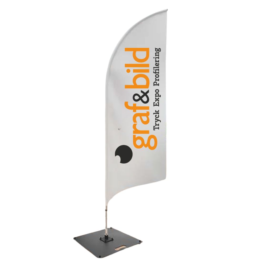 Vill du markera var du finns så räcker det med logon, företagsnamnet eller ”vad”, ex. Ingång, Cykeluthyrning etc. Ska du skapa uppmärksamhet och locka nya besökare så kanske du vill ha en text och bild. Passa på att göra något kreativt och utnyttja flaggytan – priset är detsamma oavsett storleken på tryck och antal färger.